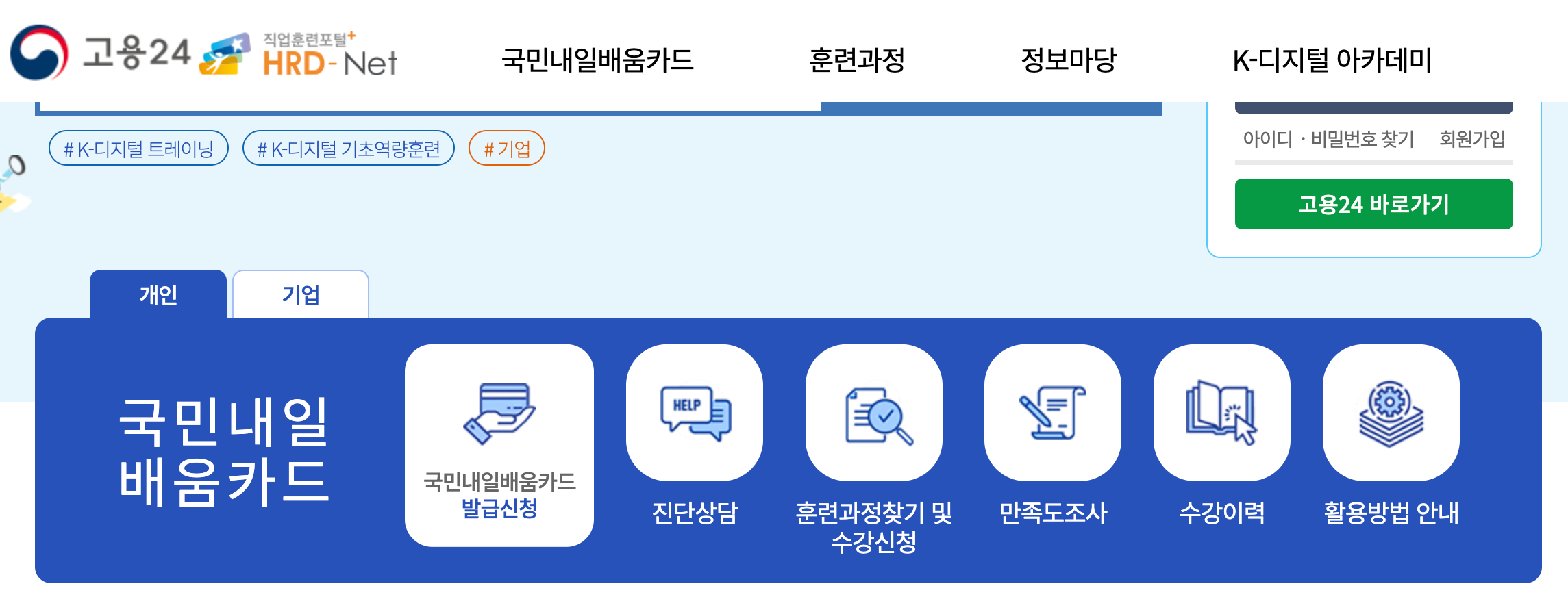 홈페이지 첫 화면에서 중간쯤에 보이는 '국민내일배움카드 발급신청'을 클릭하시면 됩니다.