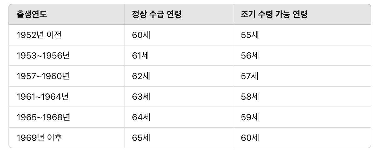| 수급 개시 시점 | 60 ~ 64세 | 65세 이후 |