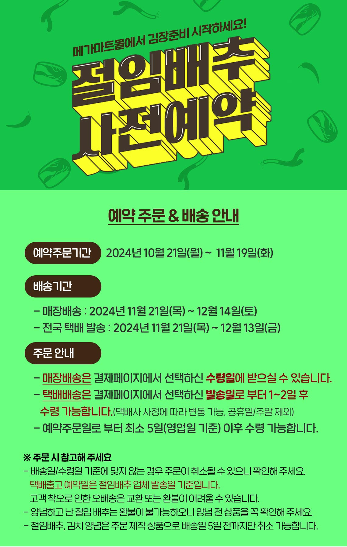 메가마트에서는 온라인으로 절임배추를 예약구매 할 수 있습니다. 기간은 2024년 10월 21일 월요일 ~ 2024년 11월 19일 화요일까지 진행이 됩니다. 만약 절임배추를 구매하지 못한 분들은 기간 안에 예약 구매하세요!
