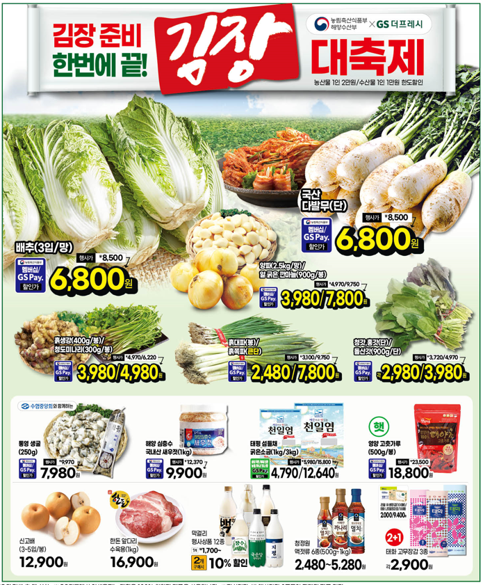 GS 더 프레시에서는 명태, 고등어, 마른 멸치, 김, 천일염, 새우젓, 멸치액젓, 굴, 갈치를 할인된 가격에 구매가 가능합니다.