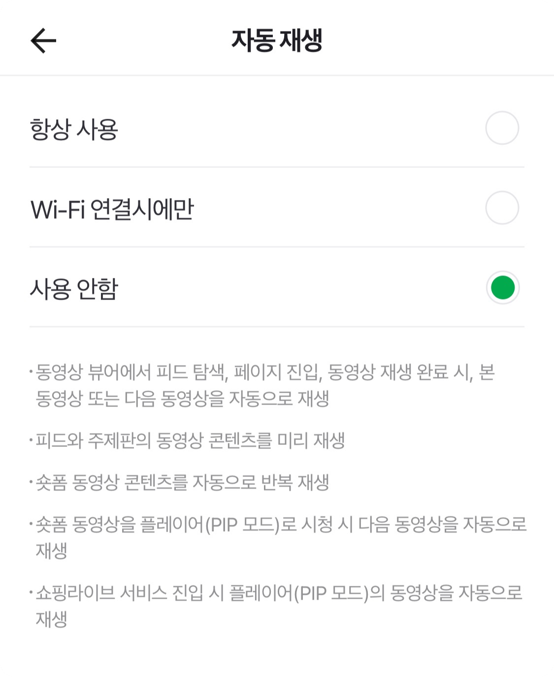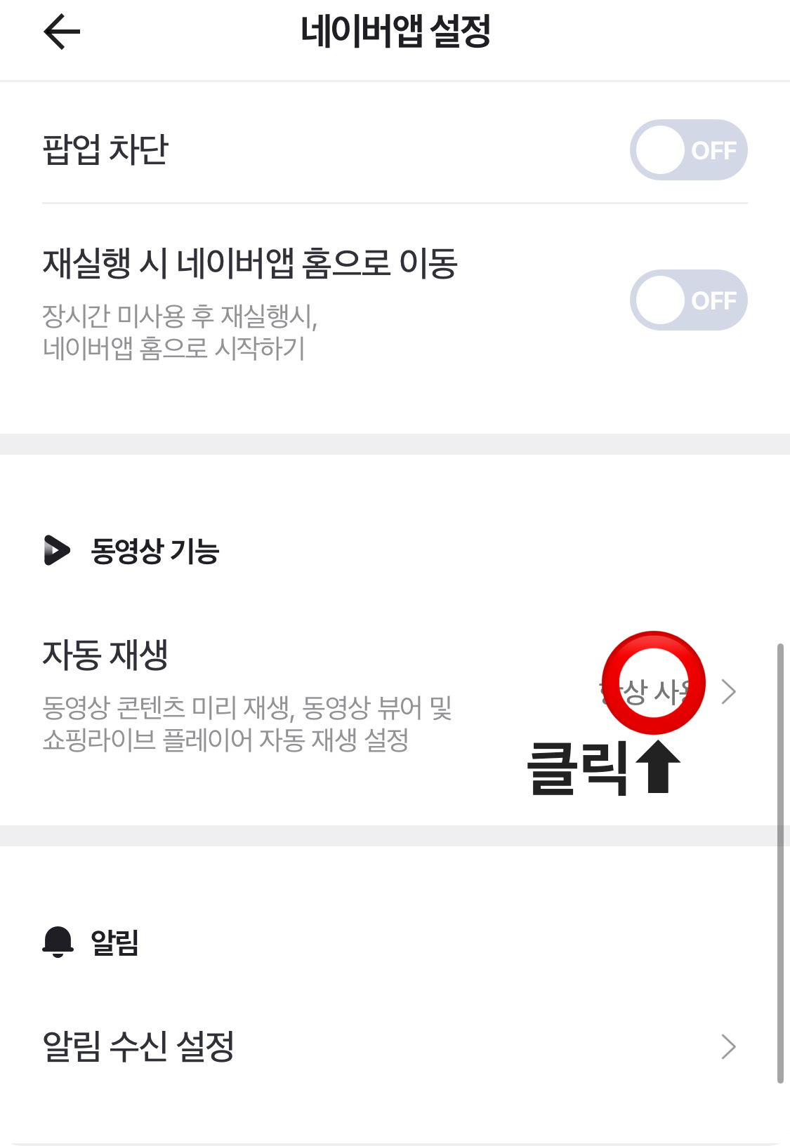 5. 스크롤을 내려서 동영상 기능> 자동재생을 항상 사용에서 사용 안함으로 바꿔줍니다.