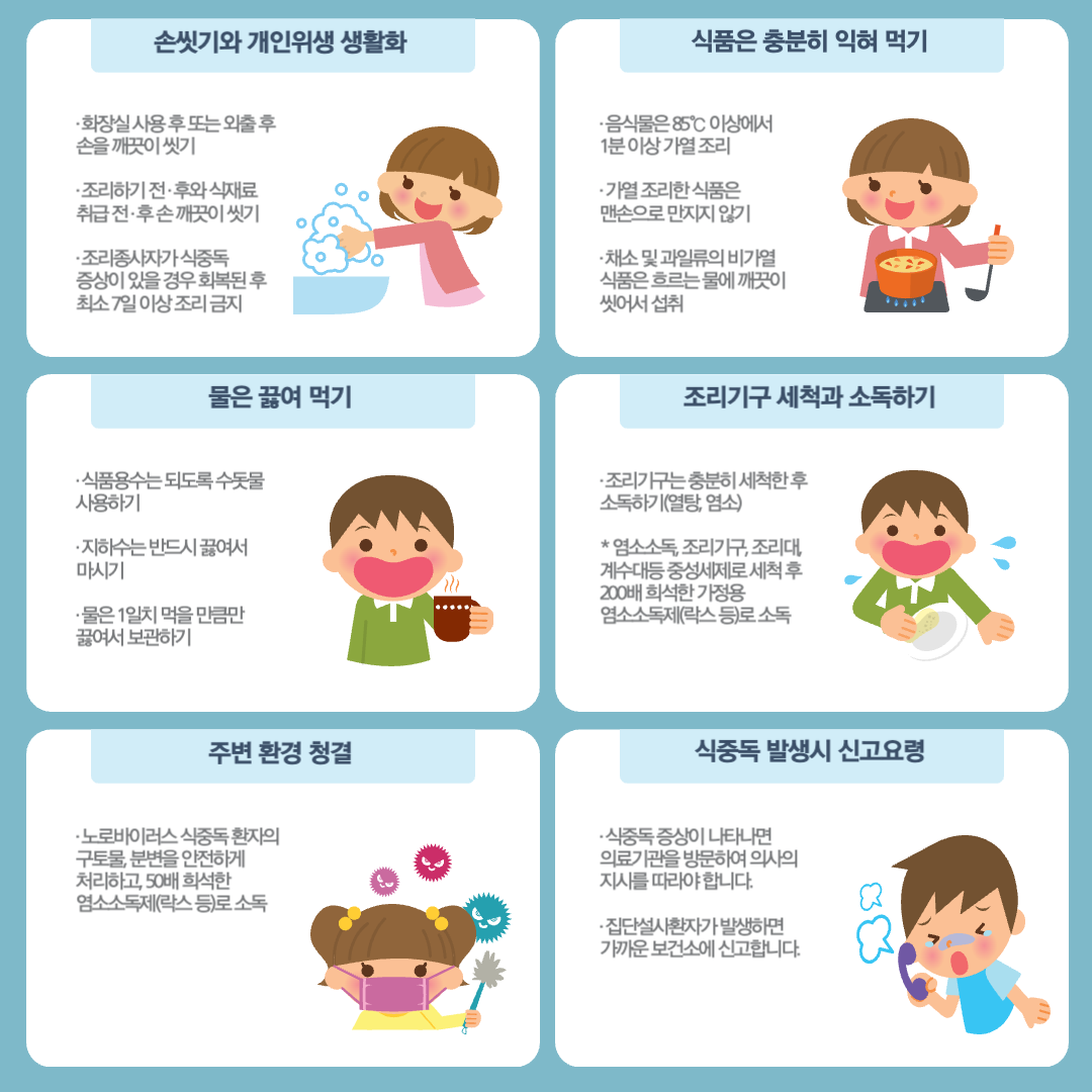 - 개인 위생 관리: 음식 조리 전후, 화장실 사용 후 손 씻기를 생활화하세요.