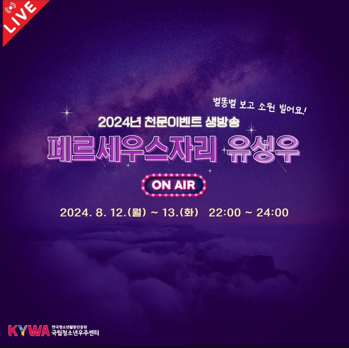✔️8월 12일 ~ 13일 이틀 동안 페르세우스유성우 극대를 맞아 온라인 생중계를 진행
