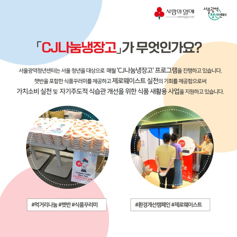 서울광역청년센터는 서울 청년을 대상으로 매월 "CJ 나눔 냉장고" 프로그램을 진행하고 있습니다.