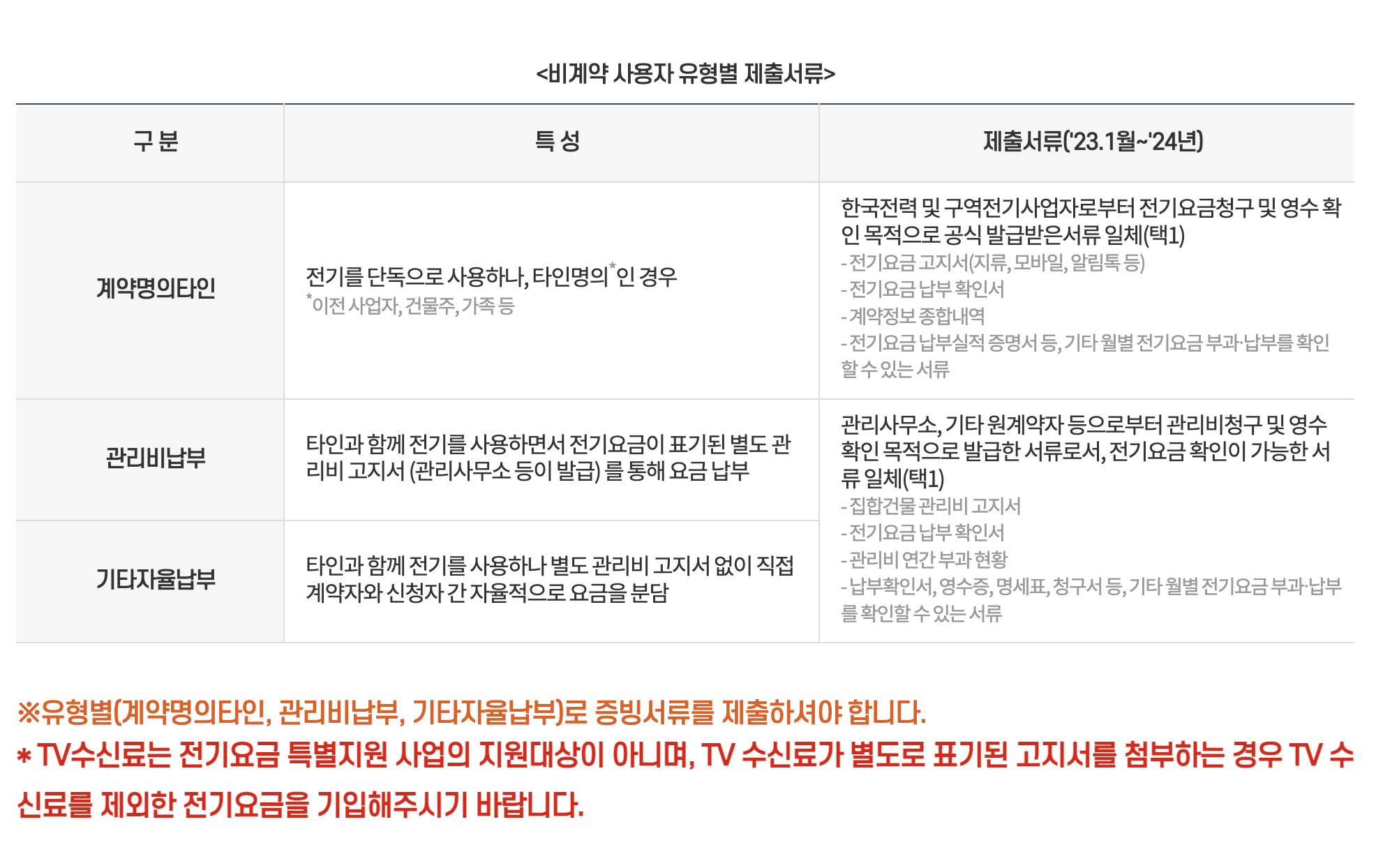 (계약자의 전기요금 고지서, 집합건물 관리비 고지서, 전기요금 납부 확인서 등 기타 월별 전기요금 부과·납부를 확인할 수 있는 서류)