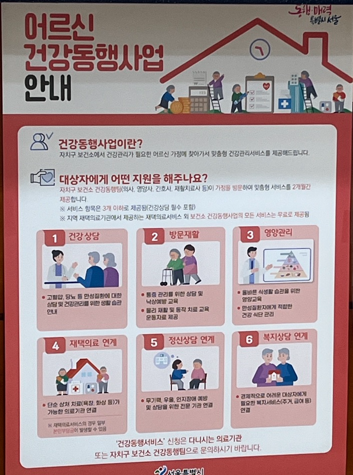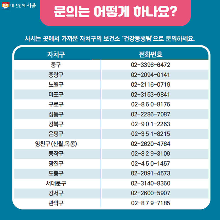 사는 곳에서 가까운 자치구의 보건소 '건강동행팀'으로 문의하시면 됩니다.