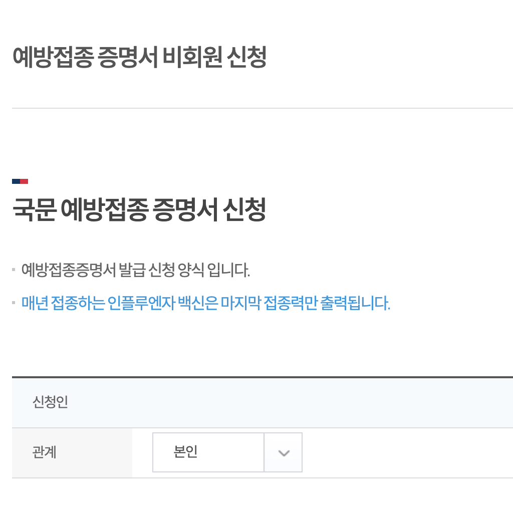 3. 예방접종증명서 신청인 칸에 정보를 기입합니다.