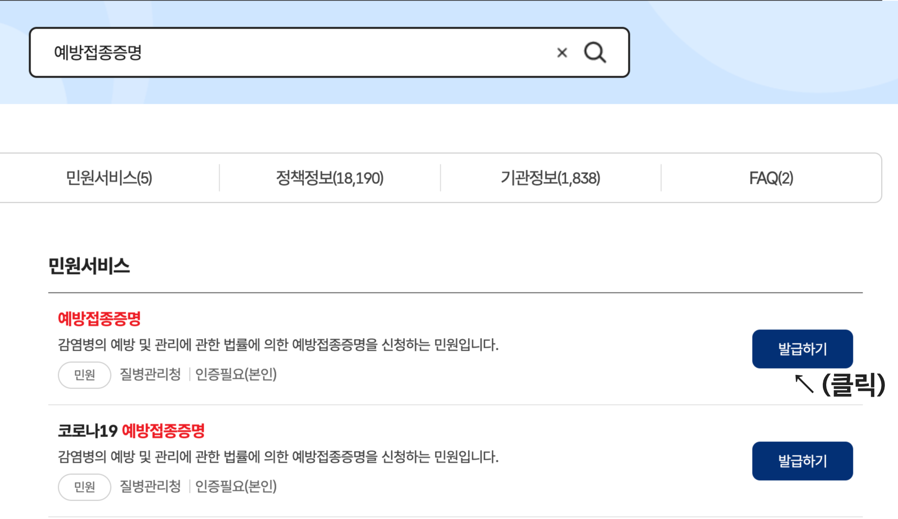 2. 통합검색창에 "예방접종증명"을 검색하여 발급하기 버튼을 클릭합니다.
