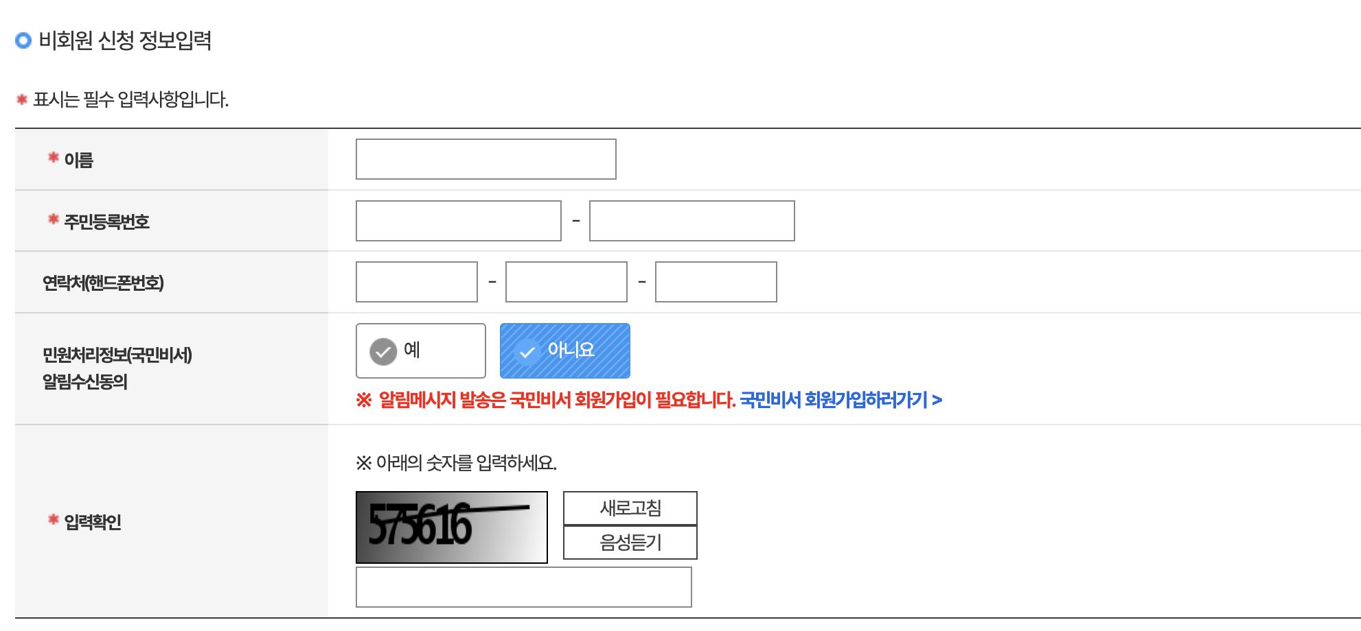 4. 해당하는 항목 입력 및 선택 후 신청버튼을 누르면 신청이 완료됩니다.