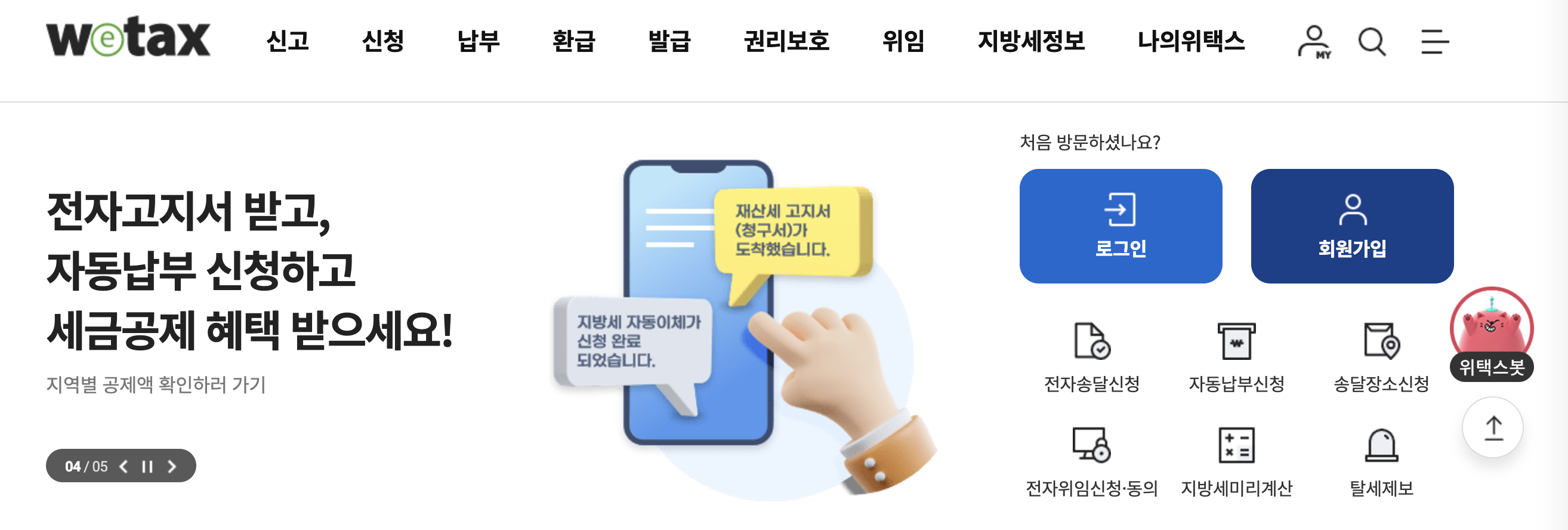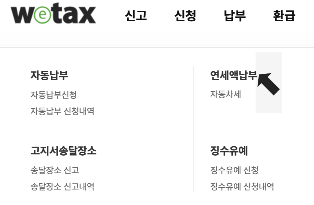 2. 우측상단 전체메뉴 클릭> 신청 클릭> 연세액납부-자동차세클릭하기