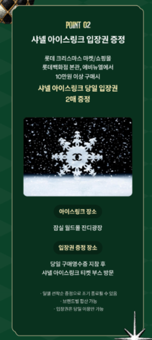 롯데크리스마스 마켓・쇼핑몰, 롯데백화점 본관・에비뉴엘에서 10만원 이상 구매 시 샤넬 아이스링크 당일 입장권 2매가 선착순으로 증정됩니다. 단, 해당 입장권은 당일에만 사용이 가능합니다.