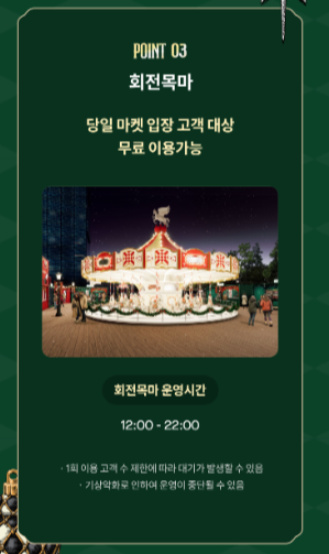 당일 마켓 입장 고객대상으로 회전목마가 무료 이용이 가능합니다. 회전목마는 1회 이용 고객 수 제한이 있기 때문에 대기가 발생할 수 있으며 기상악화로 인하여 운영이 중단이 될 수 있습니다.