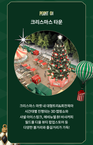 크리스마스 마켓 내 대형트리와 회전목마가 시간대별로 진행되는 3D맵핑쇼가 진행이 됩니다. 이 외에도 월드몰 디올 뷰티 팝업스토어 등 다양한 볼거리와 즐길거리가 가득 있습니다.