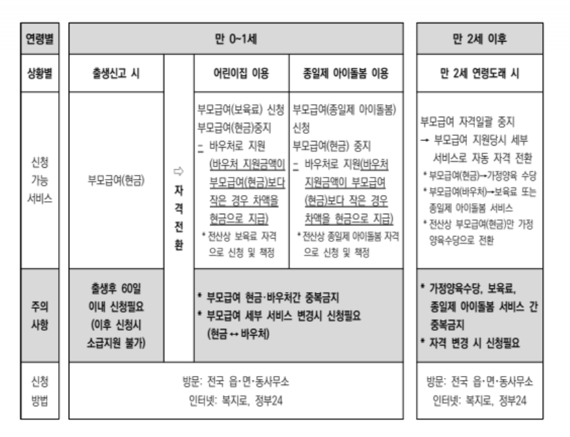 *가정 양육 시 현금, 어린이집 이용 시 보육료 바우처, 종일제 아이 돌봄서비스를 이용하는 경우 종일제 아이돌봄 바우처 지급