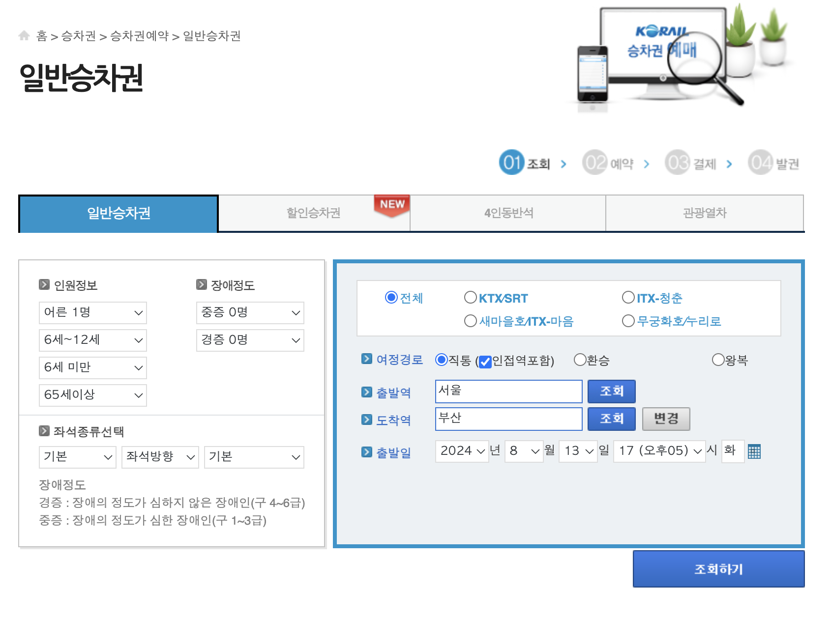 예매할 기차 구간을 미리 조회하신 후 승차권 예약을 연습을 해보세요. 예매 화면에 익숙해져야 신속하게 예매 과정을 마칠 수 있습니다.